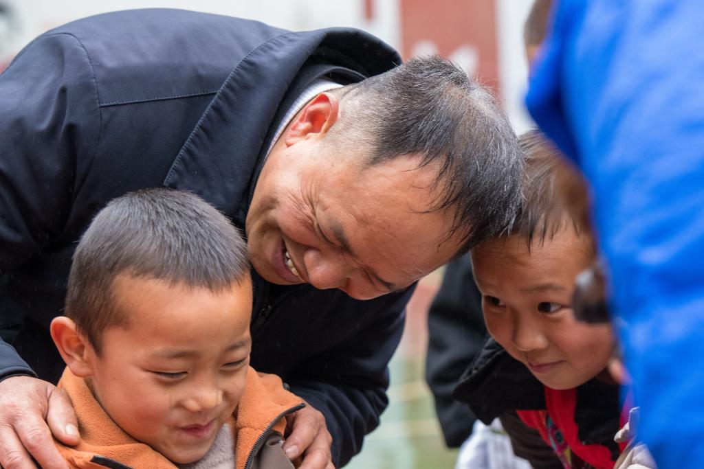 2025年2月18日,在落松地小学,农加贵(中)下课后和学生挥手告别。新华社记者 彭奕凯 摄