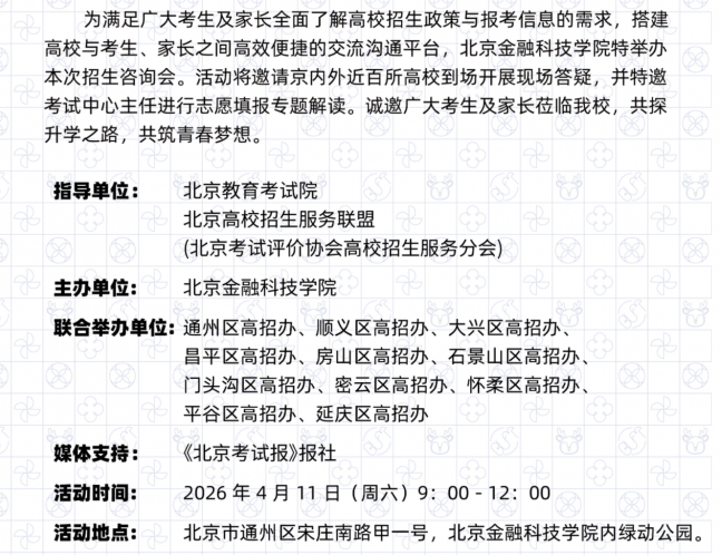4月11日(周六)上午9:00,一场干货满满的“2026年北京高校招生联合咨询会”将在北京金融科技学院盛大开启!我们为您一站式解决所有报考难题!