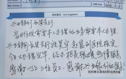 在长安支行柜员张媛的快速办理下,理财赎回业务顺利完成。看着回单,周女士连日来的愁容终于化解。她激动地在网点意见簿上写下一封表扬信,并对祝昊宇、赵崑、张媛三位员工表达了诚挚谢意,“从你们身上,我看到了兴业银行的专业和担当。”