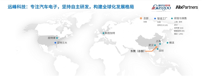 围绕智能进入、智能镜像、智能空间三大核心业务,远峰科技已搭建起全球化研产销一体化体系,在中国东莞、美国亚特兰大布局生产基地,并于美国底特律、德国斯图加特、日本横滨等地设立海外研发与营销中心,服务网络覆盖亚洲、欧洲、北美全球核心市场。