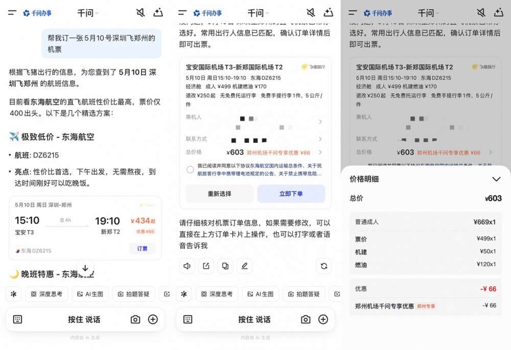 例如,当用户对千问APP说“帮我订一张5月10日深圳飞郑州的机票”,它即刻理解用户意图并推荐了HU7735、CZ6336、DZ6215、DZ6277四个不同时刻起飞的航班,4张机票均有66元“郑州机场千问专享优惠”,点击具体航班卡片即可进入确认和支付环节。