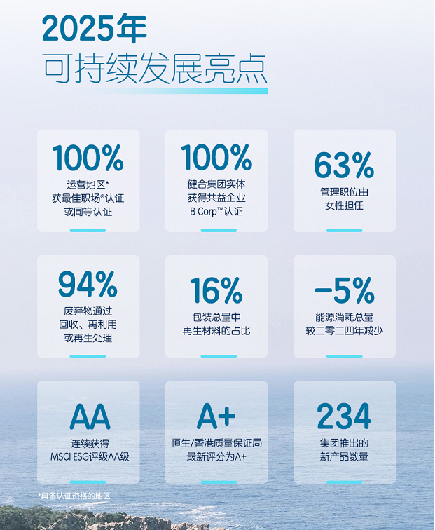 2025年,集团进一步强化可持续发展管治措施:全球团队成员已100%完成集团合规培训,尤其是新入职员工;经评估的供应商中,100%遵守健合集团《供应商行为准则》。健合集团通过对内加强自身运营管理,对外提升价值链风险管理与韧性,将可持续发展融入战略及运营的各个环节,全面践行可持续发展承诺。