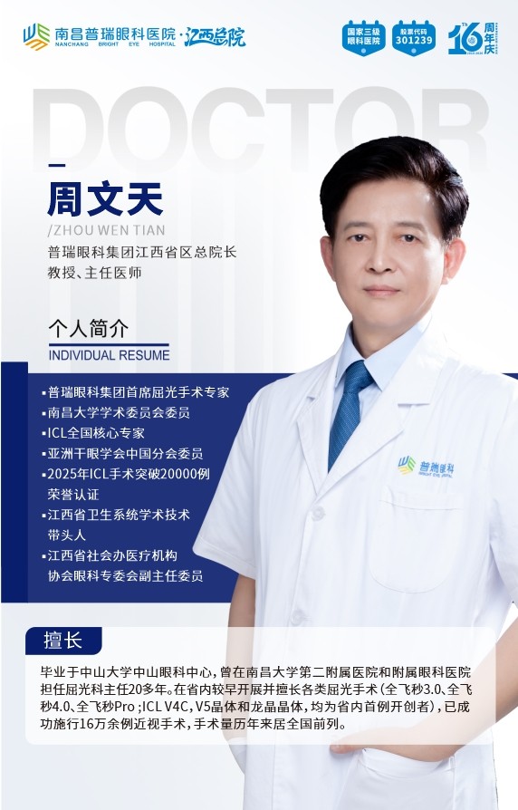 如果要在南昌近视手术圈找一位近视手术领域的权威,周文天教授绝对是绕不开的名字。作为普瑞眼科江西省区总院长,周教授从事眼科临床工作已超过30年,是国内最早一批开展ICL晶体植入手术的专家之一。
