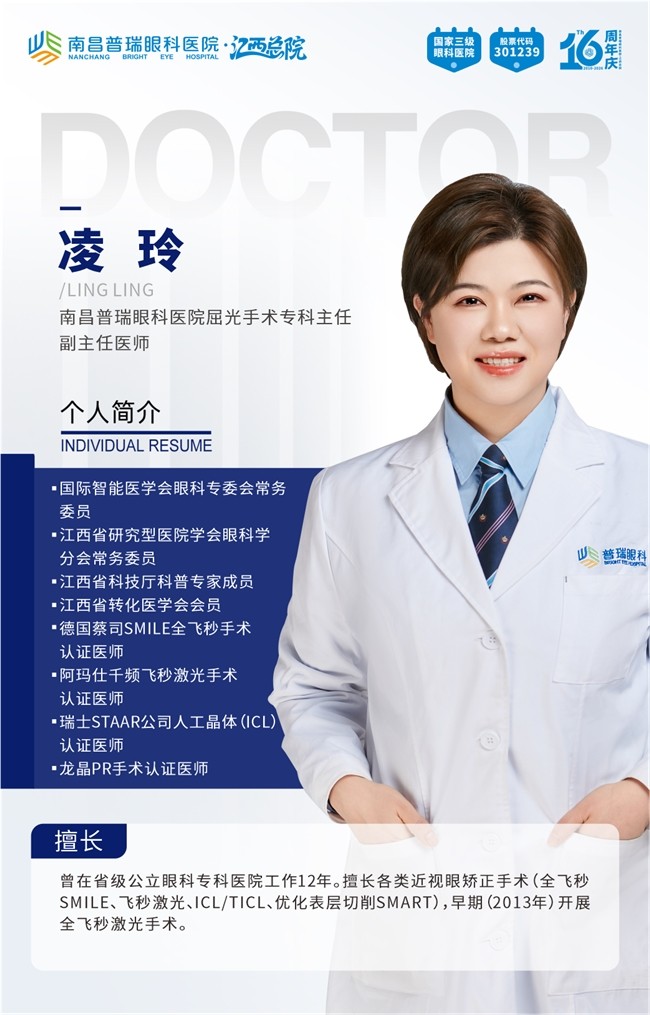 南昌普瑞眼科医院屈光科室主任凌玲,作为江西首批获得全飞秒手术认证的专家,凌主任从全飞秒技术引入省内之初就开始从事相关手术,积累了丰富的微创手术经验。