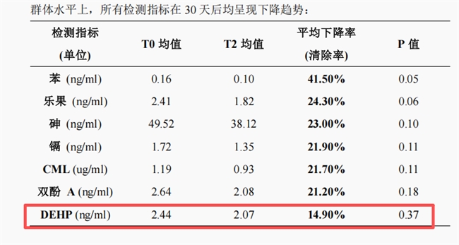 据了解,这项临床研究纳入30名受试者,进行为期30天的排毒干预临床实验。最终得出核心结论:还原型辅酶I(NADH)能实现显著的体内毒素清除效果,其中血管内常见的塑化剂(DEHP)、双酚A(BPA)等7项核心毒素指标均呈显著下降趋势,苯的平均清除率更是高达60%,71%的受试者各项核心毒素指标下降达到统计学显著水平,平均清除率稳定在30%-50%之间。