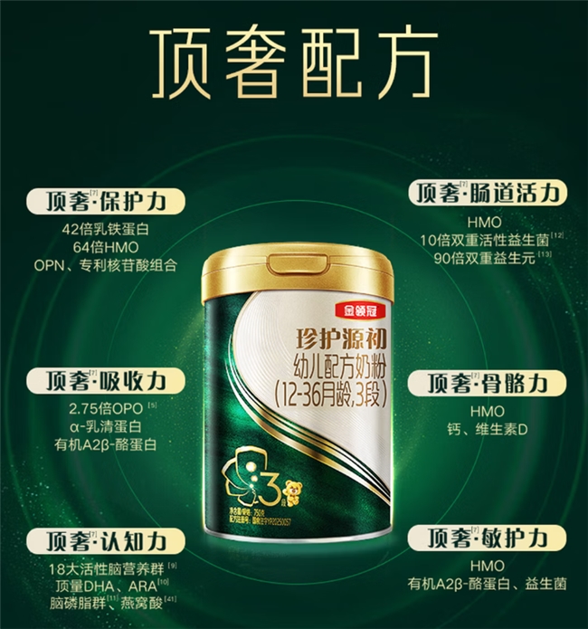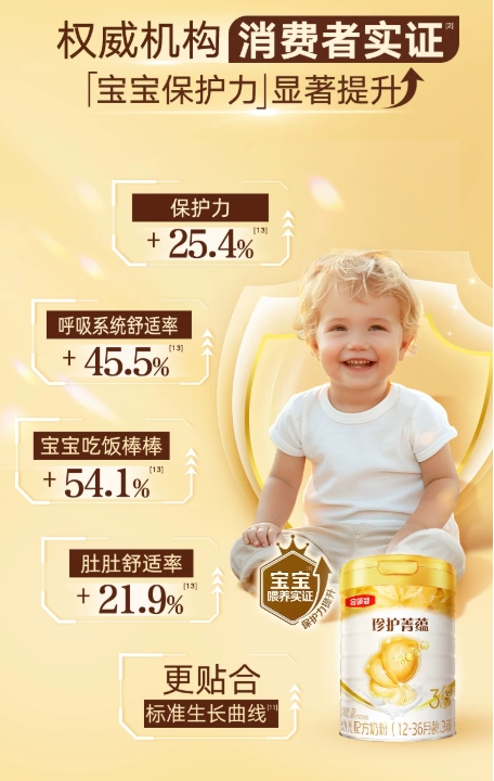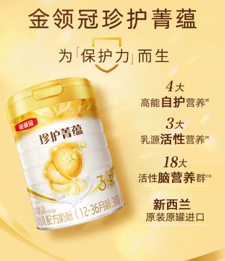 珍护菁蕴是金领冠家族中的“进口担当”,聚焦保护力强化,同时兼顾吸收与认知发育,适合特别关注宝宝抵抗力的家庭。