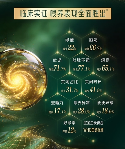 权威RCT临床实证:喂养表现全面胜出!绿便、溢奶、吐奶、肚肚不适等症状大幅减少,有效缓解宝宝烦躁哭闹,使安睡力有效提升,致敏率也有所降低。宝宝生长符合WHO生长标准,喂养更高效!