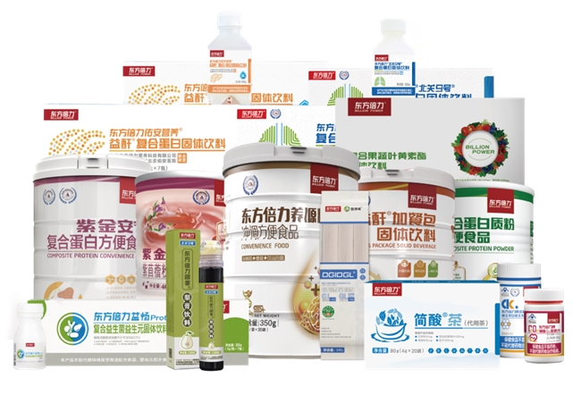 东方倍力研发生产十余款系统营养产品,其中保健食品:东方倍力辅酶Q10咀嚼片、东方倍力多种矿物质维生素D维生素K软胶囊、东方倍力香菇灰树花赖氨酸粉;东方倍力与三甲医院联合研发产品:东方倍力佑安营养特殊膳食营养粉、东方倍力北关9号复合蛋白固体饮料、东方倍力京医营养复合蛋白固体饮料。东方倍力药食同源产品:东方倍力北关9号四季梨膏饮料、东方倍力简酸茶、东方倍力紫金安糖牌本草饮料。东方倍力常规产品:东方倍力紫金灵脂紫苜蓿粉固体饮料、东方倍力紫金安节复合蛋白方便食品、东方倍力复合蛋白质粉方便食品、东方倍力益畅Pro6复合益生菌益生元固体饮料、东方倍力复合果蔬叶黄素酯固体饮料、东方倍力益酐加餐固体饮料、东方倍力养源粉冲调方便食品等。