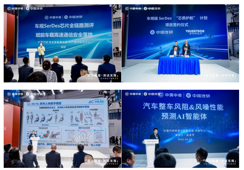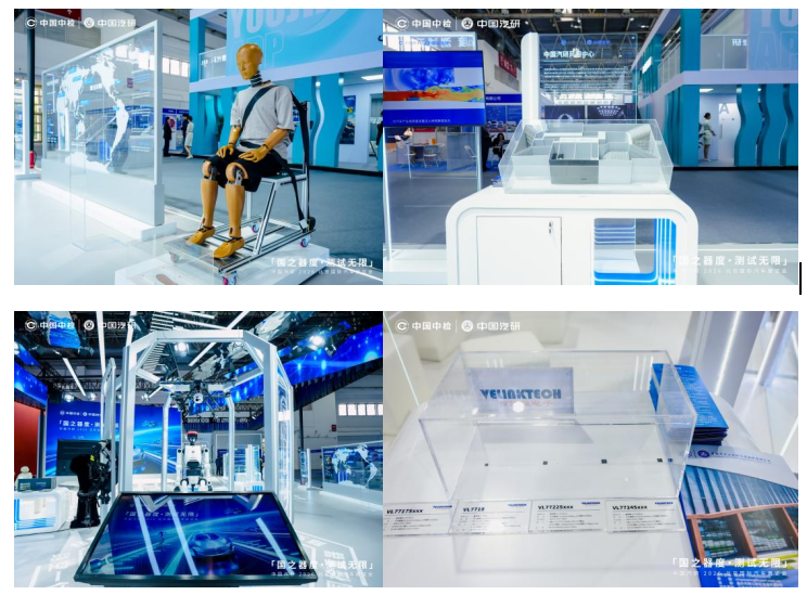 检测工程事业部展出国产中国体征汽车碰撞人体损伤测量装备、数智风洞AI平台沙盘,展示被动安全与空气动力学测试能力;信息智能事业部聚焦智能网联与车规芯片,呈现全场景智驾测评、功能安全测试及芯片测评能力;标准指数中心围绕“大安全”,展示C-IASI中国保险汽车安全指数、IVISTA中国智能汽车指数、C-AHI中国汽车健康指数三大评价体系,将隐性技术显性化;机器人检测公司则带来自动化检测与测试机器人,体现智能测试效率与精度。