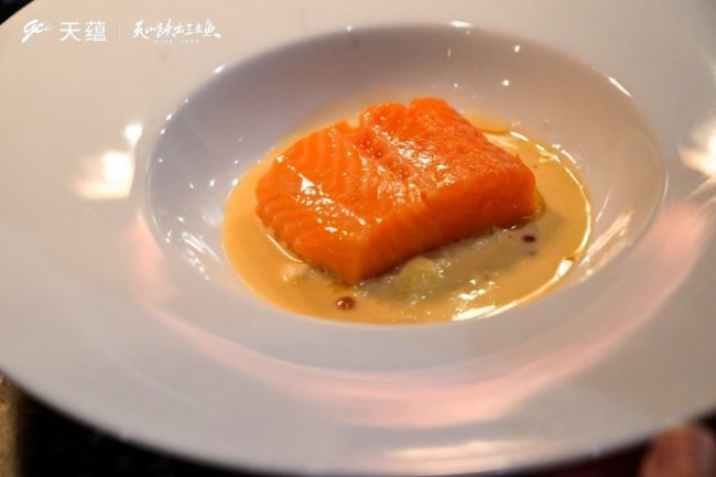 晚宴现场,Chef Eddy用低温油封的方式,保留了天蕴三文鱼最本真的味道。没有过多的调料,只有一点点盐和时间的耐心。