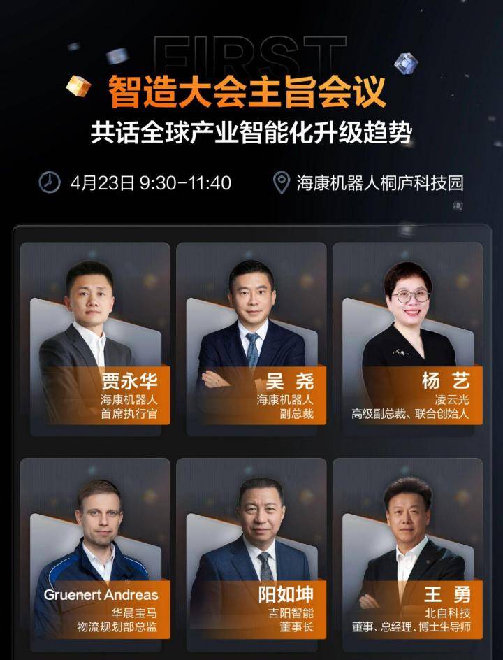 4月23日是大会的“主旨会议”环节。届时,海康机器人首席执行官贾永华、副总裁吴尧,机器视觉产业联盟副理事长、凌云光高级副总裁兼联合创始人杨艺,华晨宝马物流规划部总监GruenertAndreas,吉阳智能董事长阳如坤,北自科技董事、总经理、博士生导师王勇等行业大咖齐聚一堂。他们将从各自领域出发,分享前瞻洞察,共话全球产业智能化升级趋势。