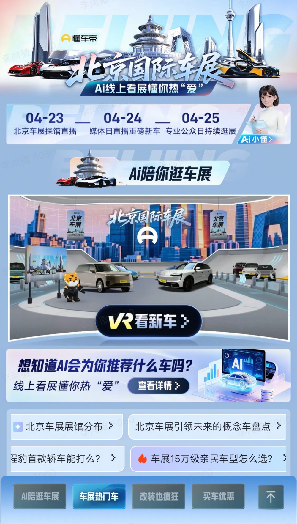 本次车展期间,买卖懂车帝在首都国际会展中心(新国展二期)B2馆M06展台展出。用玩作为本次参展的核心亮点,“懂车帝AI小懂”正式首发亮相,这是懂车帝平台自2025年推出AI选车以来,再次升级的汽车生活全环节专属服务助手,凭借高精度智能交互、专属汽车知识库、深度多轮对话、海量真实用户评价等核心能力,全程陪伴用户完成选车、买车、卖车、用车、玩车等多个场景。