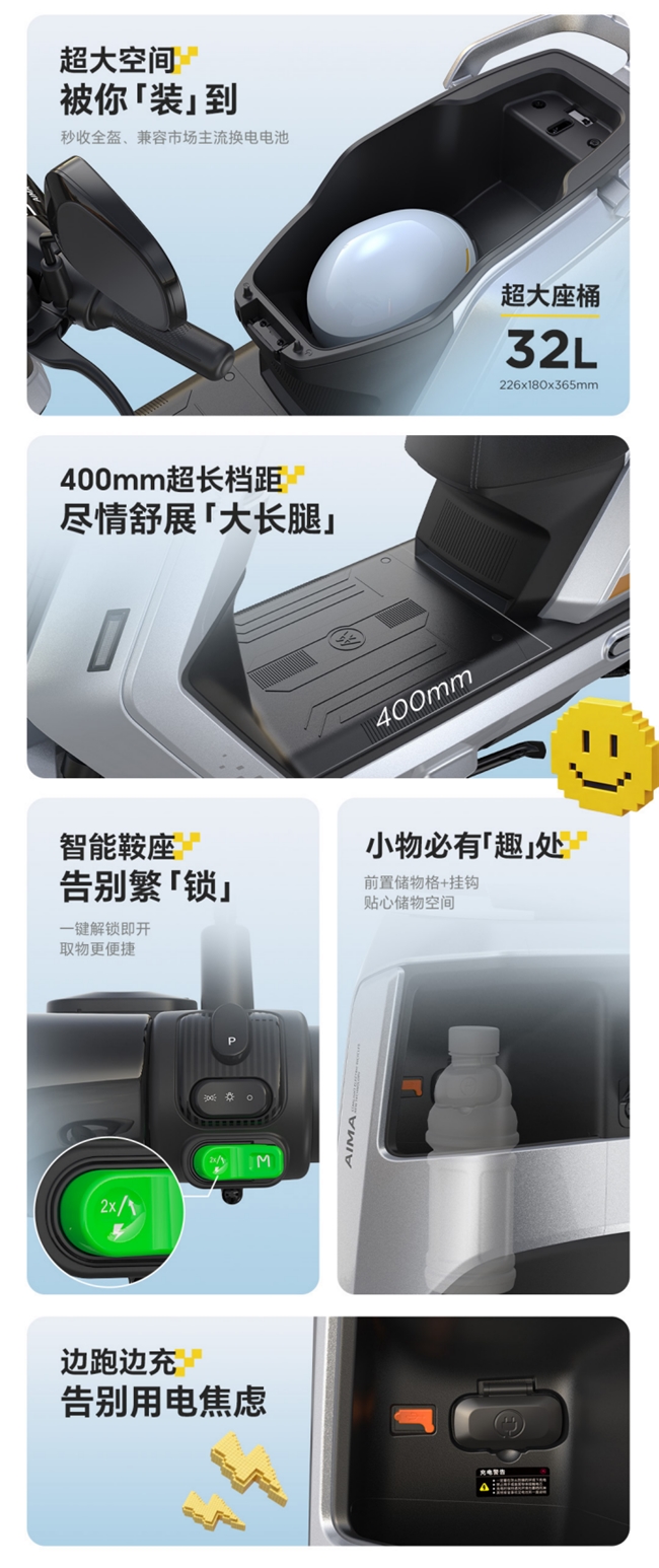 细节很贴心:390mm黄金档距,高矮个子骑久了都不累;27L超大座桶,全盔、配送袋、备用电池轻松装下,不用额外背包;闪电黄、璀璨白等配色,潮又耐脏,适配各类场景。