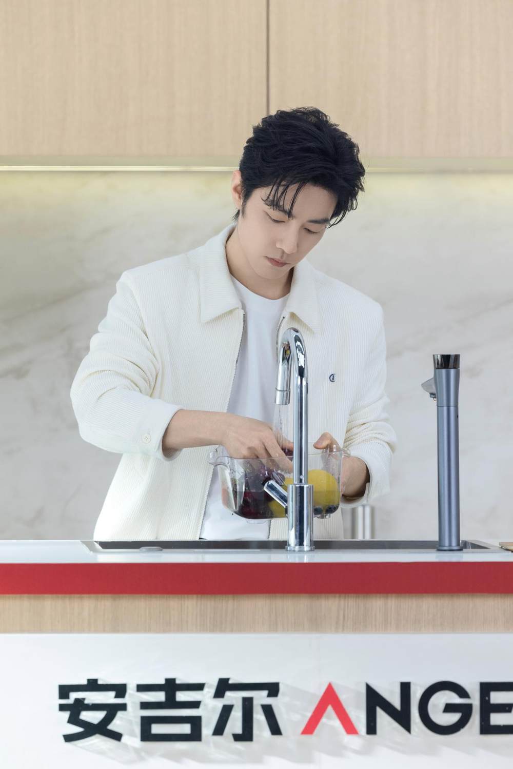 肖战以真实体验者的身份,依次体验晨间直饮、午间食材清洗、午后饮品制作、晚间软水护肤等全场景用水环节,现场参与余氯实验、亲测软水护肤效果并亲手制作饮品,深度体验安吉尔空间大师M7系列、黄金比矿物质饮水机、空间大师全屋Mini软水机超能版等产品带来的健康舒适用水体验。