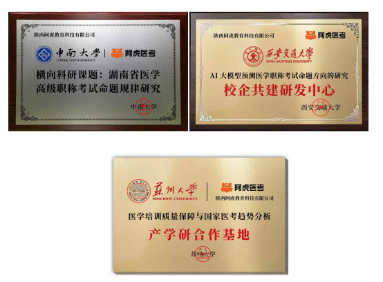 在教研端,相关举措进一步践行了“成为优质选择”的愿景方向。阿虎医考先后联动三大高校开展深度合作:与西安交通大学联合成立“AI大模型预测医学职称考试命题方向研究中心”,借助模型深度学习探索命题趋势;与中南大学组建专项课题组,依托湘雅医学院科研优势挖掘职称命题规律;与苏州大学共建产学研合作基地,搭建大数据平台分析命题变化。