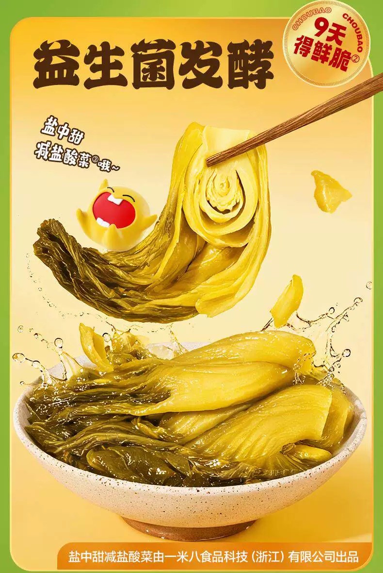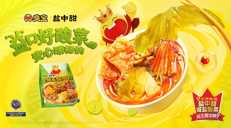 近期,模达螺蛳粉头部品牌臭宝与阿里农业板块一米八旗下品牌“盐中甜”联合推出金酸菜柳州螺蛳粉。臭宝鲜浓螺蛳汤底搭配清爽的益生菌发酵酸菜,为消费者带来全新的嗦粉体验。金酸菜柳州螺蛳粉的核心亮点在于盐中甜益生菌发酵酸菜,采用益生菌直投发酵技术,9天短时精准发酵,更大程度上保留了蔬菜本身的营养以及脆爽口感。区别于传统高盐腌渍的方式,益生菌酸菜发酵过程更健康可控,不用担心亚硝酸盐、添加剂等问题,也打消了很多消费者想吃酸菜又望而却步的顾虑。值得一提的是,臭宝和盐中甜选用云南小叶芥菜制作酸菜,保留大块形状,短时发酵后酸菜根茎呈金黄色——这也是“金酸菜”名称的由来。此外,为了让酸菜和螺蛳粉的风味相得益彰,臭宝品牌为金酸菜螺蛳粉研发“专研伴酱”作为风味联结剂,使酸菜的发酵酸香与螺蛳汤底的鲜辣螺香形成层次递进,实现“酸中带鲜”的味觉结构。